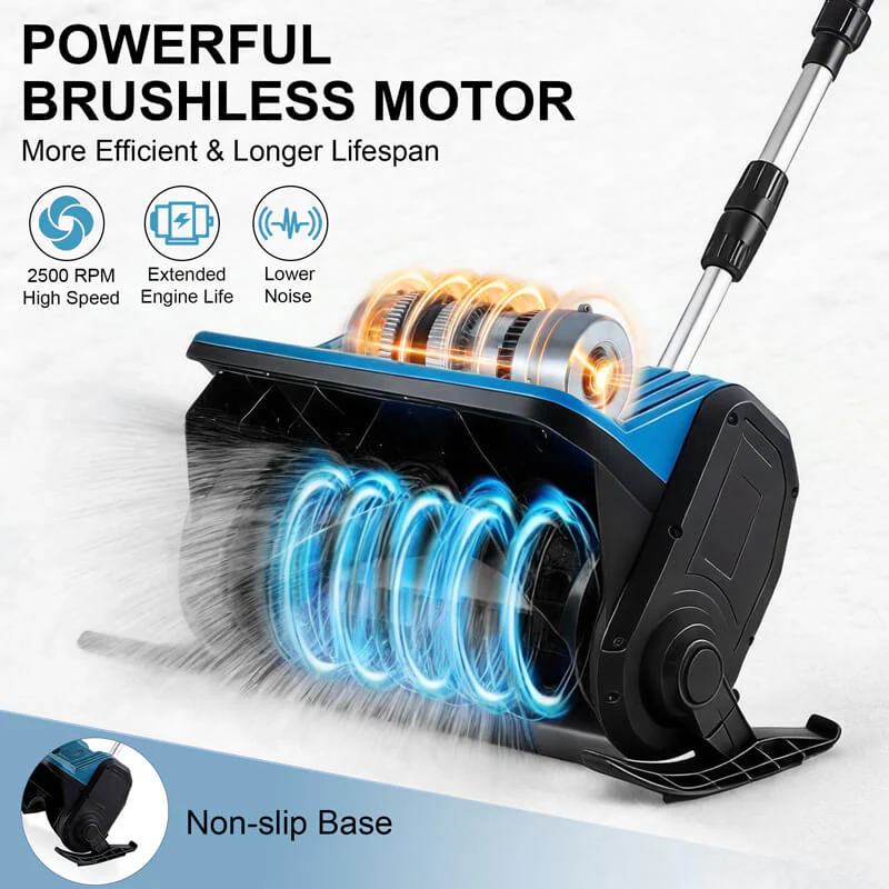 The cordless snow blower high-performance 1000W motor reaches 2500 RPM for powerful, consistent snow clearing, while the innovative auger rotation design maximizes torque and reduces energy loss—achieving over 30% higher efficiency than conventional designs.