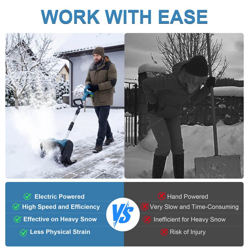 Clearing up to 12 inches wide and 9 inches deep while throwing snow up to 19.7 ft, much faster and wider cleaning coverage than other cordless snow shovel.