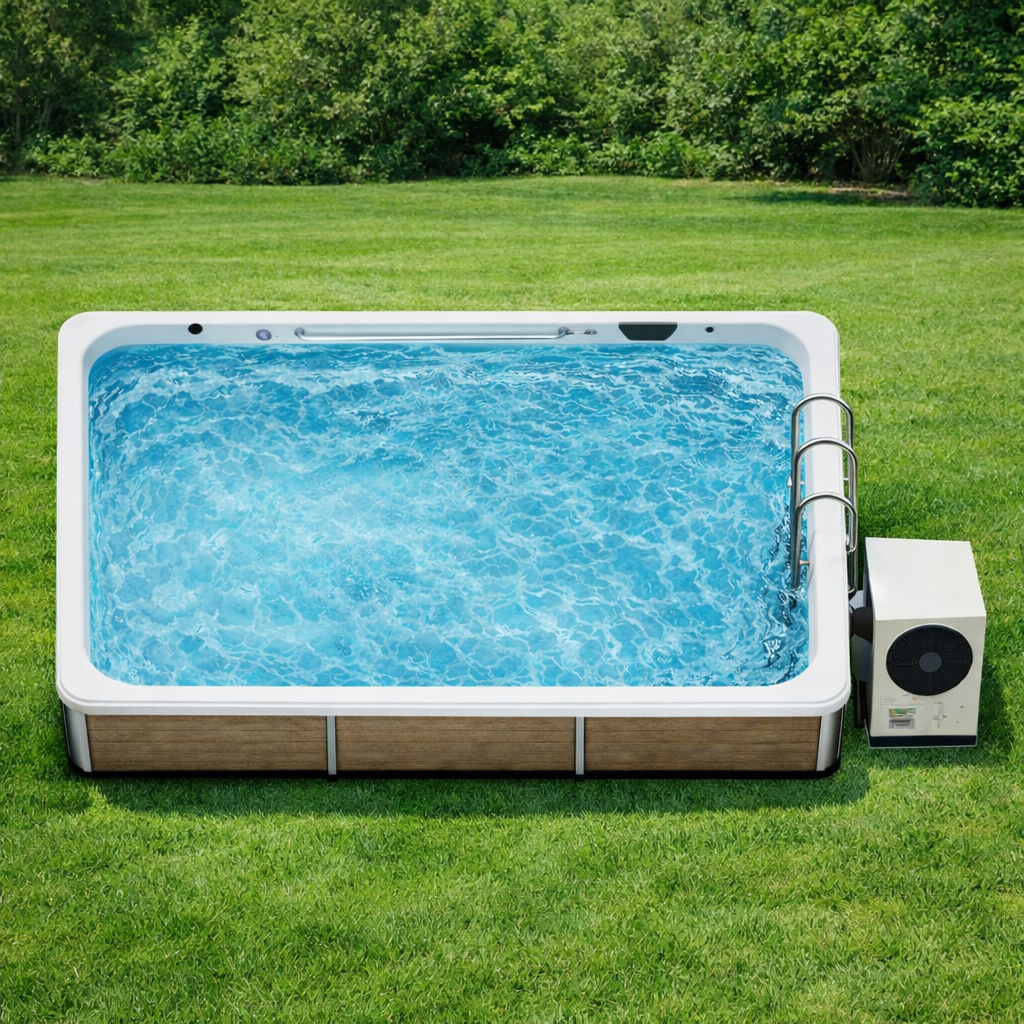 The rectangular design allows for light lap swimming, water exercise, or relaxation. An external pump and heater system maintains water circulation and temperature, extending usability beyond peak summer months. A stainless-steel ladder ensures safe entry and exit. Designed to meet U.S. residential outdoor standards, the unit is typically installed on a concrete pad or reinforced base.