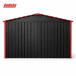 This is a robust, all-weather metal storage shed characterized by its corrugated steel panel construction for added rigidity and a distinctive aesthetic. The structure utilizes galvanized steel, often coated in an epoxy or polyester paint finish, to ensure maximum resistance to corrosion and UV degradation, making it virtually maintenance-free. It features a traditional gable roof designed for efficient water and snow runoff. The front-facing, centrally located double doors provide a large, convenient opening for storing bulky items like wheelbarrows, lawnmowers, and bicycles. For proper air circulation, the shed is equipped with integrated air vents to minimize condensation and keep the contents fresh and dry.