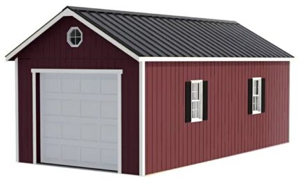 The open-front bay design allows vehicles, riding lawn mowers, ATVs, trailers, or large equipment to be stored and accessed easily. Integrated wall vents promote airflow and reduce heat buildup inside. A gable roof structure improves strength and allows rain and snow runoff. The shed is intended for DIY assembly and installation on a concrete slab or prepared foundation.