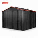 The Gadisha Premium Industrial Shed combines a contemporary industrial look with maximum durability. The main structure utilizes commercial-grade, corrugated steel panels finished in a deep matte black, which offers excellent protection against rust, corrosion, and the elements. The roof features a classic gable design for efficient water runoff and is accented with bold, contrasting red trim, which also runs down the vertical corner posts. It is designed with a high wall and peak clearance for maximum vertical storage and ease of movement, accommodating tall items like ladders and shelving. Access is provided by wide, lockable double-doors designed to allow easy entry for lawnmowers, ATVs, and other large equipment.